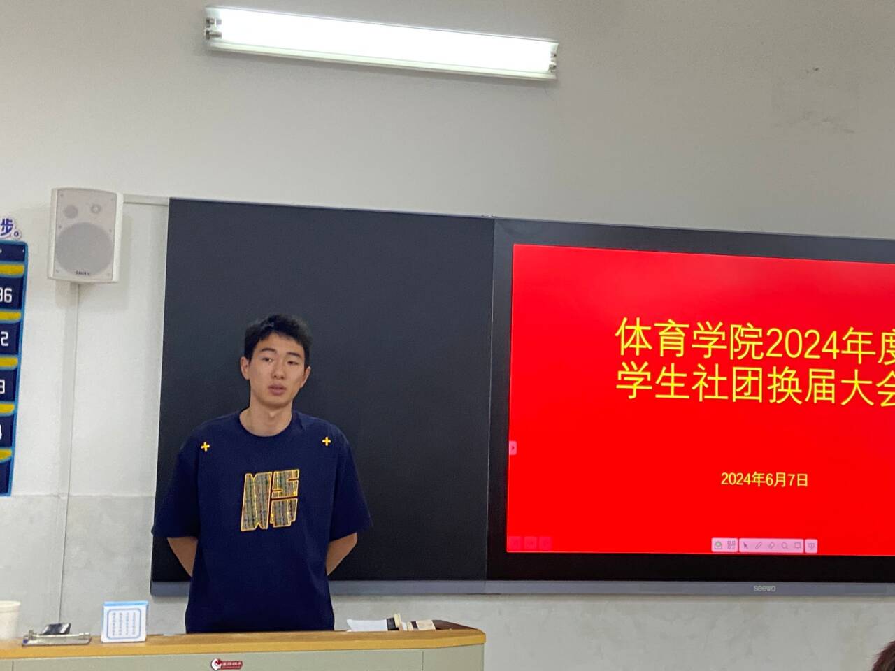 为了体育类社团更好的发展,锻炼同学们的能力,新葡的京集团350vip于2024年6月7日中午12:20在新葡的京集团350vip新馆A109教室举行学生社团换届大会,莅临本次换届大会的评委老师有新葡的京集团350vip团委书记胡杰、各社团指导老师以及社团负责人李若齐。十个社团社长以及各社团候选人参加本次换届大会。